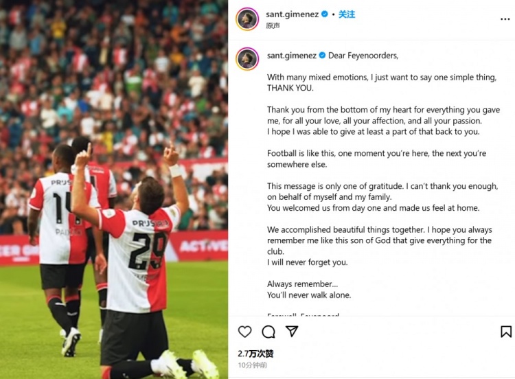 希门尼斯表示:“亲爱的费耶诺德球迷们,我现在百感交集,只想说一句简单的话语:感谢你们。我发自心底感激你们给予我的一切,感谢你们所有的爱与激情。我希望我在此前已经多少回报了一部分。”