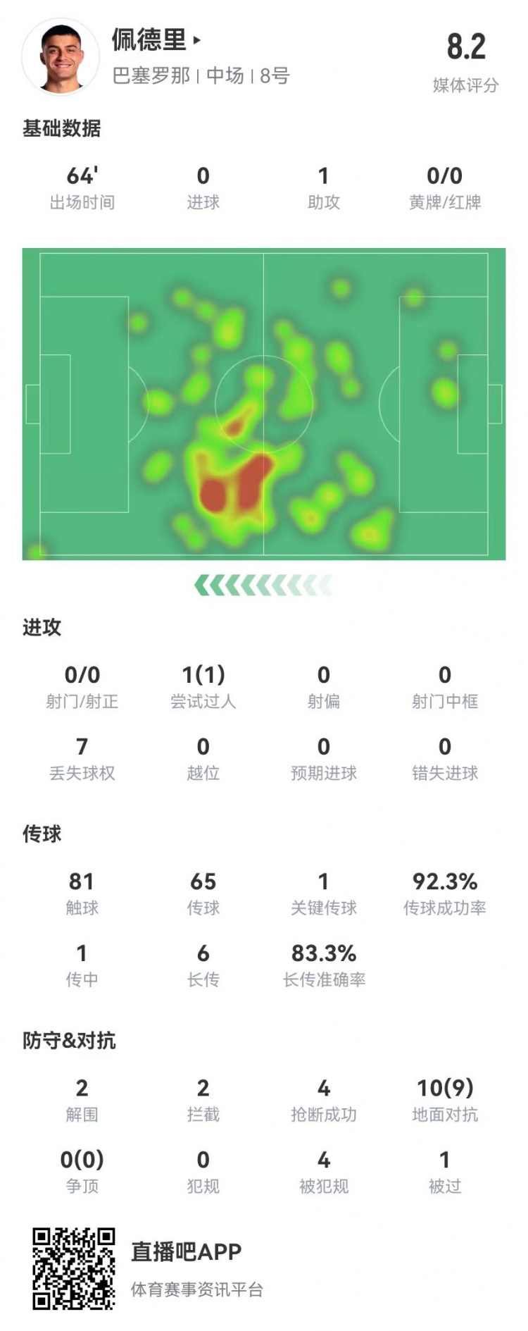 佩德里本场1助攻+5成功长传 10对抗9成功 4造犯规4抢断 获评8.2分